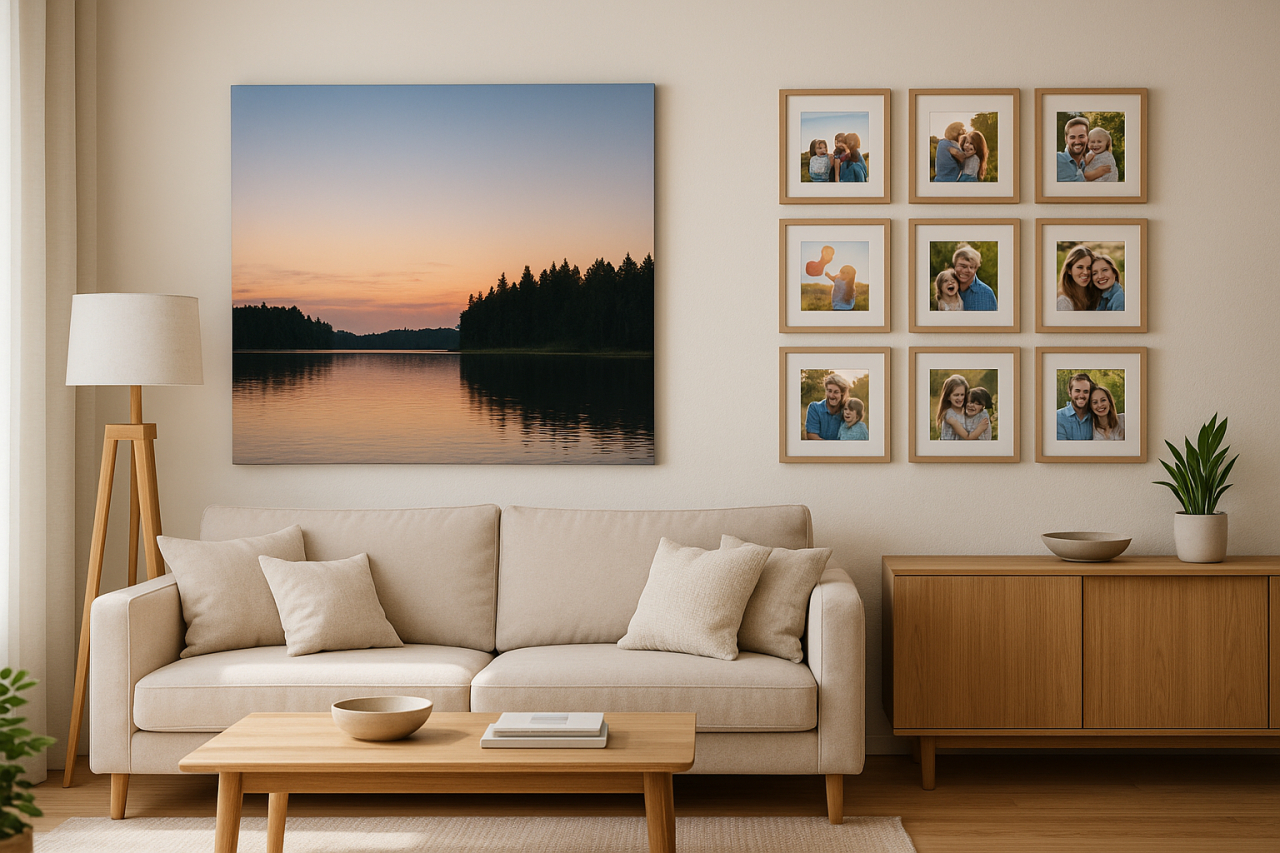 Galerie ścienne miksujące kadry rodzinne z autorską fotografią i sztuką generatywną.