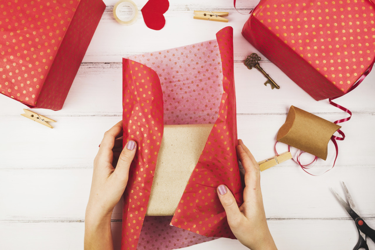 - Ozdobny papier do prezentów – sprawdzi się zwłaszcza podczas pakowania płaskich przedmiotów, takich jak puzzle czy bombonierka w kształcie serca.